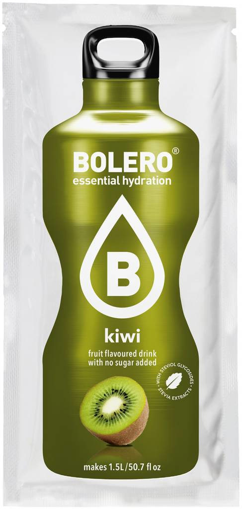 Bebida Bolero con sabor a Kiwi. Con cada sobre de la bebida Bolero podrás prepararte 1,5 litros de tu bebida favorita. Las bebidas Bolero no contienen nada de azúcar, son aptas para todo tipo de personas, ya que no contienen ningún tipo de alérgeno.