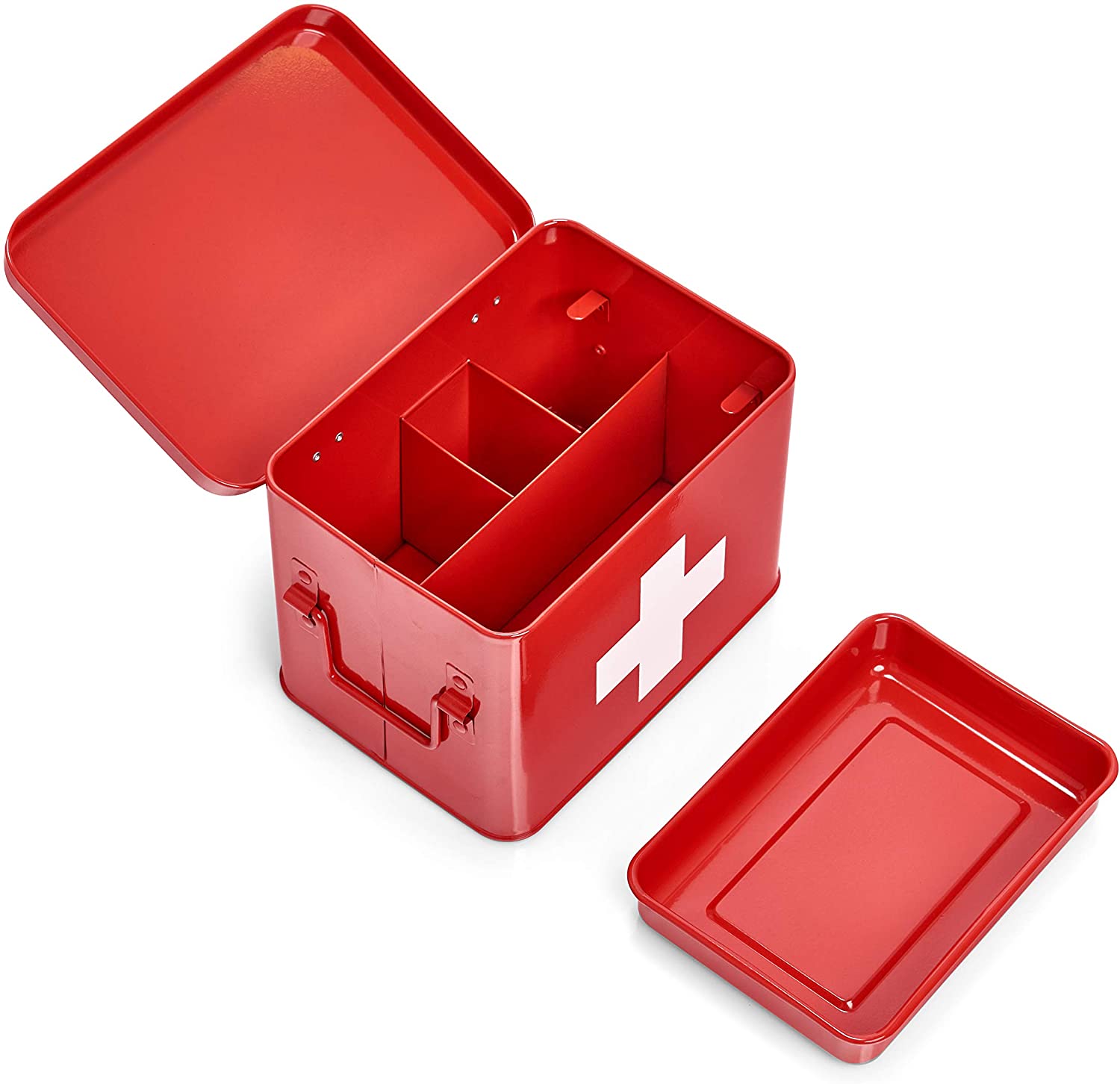 Caja botiquín retro de farmacia de acero inoxidable roja para guardar medicamentos y utensilios.