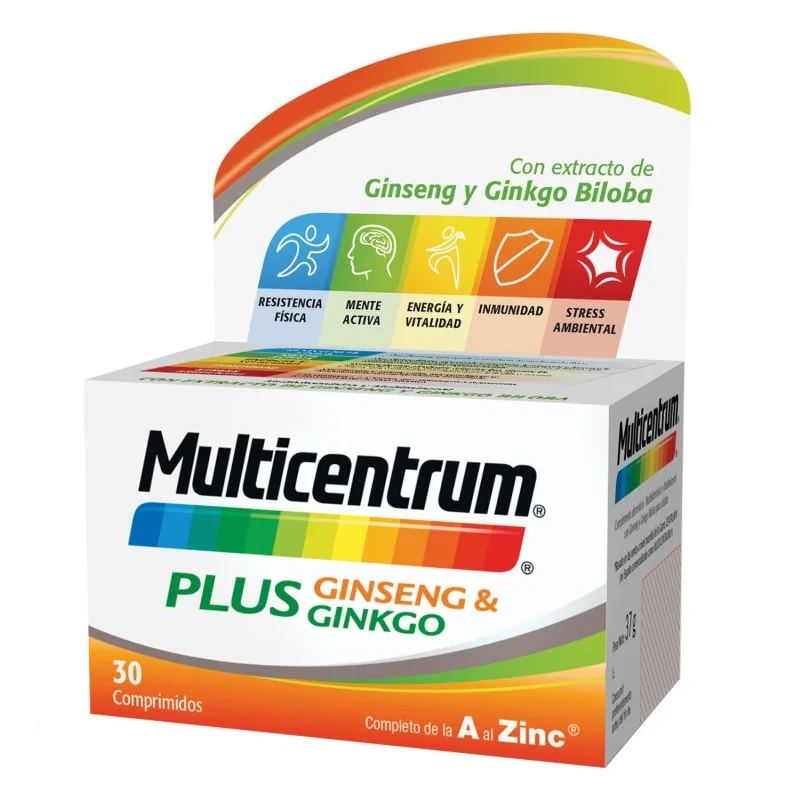 Fosfato dicálcico, cloruro potásico, ácido L-ascórbico, incrementador de volumen (E 460, E 464), carbonato cálcico, óxido de magnesio, extracto de Ginkgo Biloba, extracto de Panax Ginseng, acetato DL-alfa tocoferilo, fumarato ferroso, nicotinamida, almidón modificado, maltodextrina, estabilizador (E 1202), D-pantotenato de calcio, sulfato de manganeso, óxido de zinc, piridoxina clorhidrato, mononitrato de tiamina, riboflavina, emulgente (E 470b, E 433), antiaglomerante (E 551), almidón, beta-caroteno, gelatina, sulfato cúprico, jarabe de glucosa, sacarosa, cloruro de cromo (III), acetato de retinilo, ácido pteroilmonoglutámico, molibdato de sodio, yoduro potásico, seleniato sódico, aceite de palma, D-biotina, antioxidante (E 321), filoquinona, cianocobalamina, colecalciferol, colorantes (E 171, E 172).