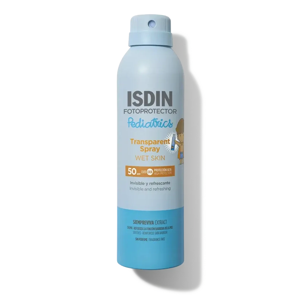 Protector Solar Spray Isdin pediatrics con tecnología Isdin wet skin ofrece un fotoprotector pediátrico ultraligero que se absorbe sobre piel seca y húmeda sin dejar residuo blanco. Su fórmula calmante y a prueba de agua adapta la aplicación al ritmo de los más pequeños.