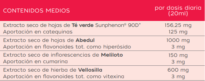 Agua, maltodextrinas, espesantes: sorbitol, goma de Xantano; extracto seco de hojas de abedul (Betula pendula Roth) titulado al 0,3% en flavonoides totales expresados como hiperósido, extracto seco de hierba vellosilla (Hieracium pilosella L.) titulado al 0,5% en flavonoides totales expresados como vitexina, extracto seco de hojas de té verde (Sunphenon® 90D*) titulado al 80% en catequinas (Camellia sinensis L. Kuntze), extracto seco de inflorescencias de meliloto (Melilotus officinalis (L.) Lam.) titulado al 2% en cumarina, corrector de acidez: ácido L-Ascórbico; aroma, conservantes: sorbato de potasio, benzoato de sodio.