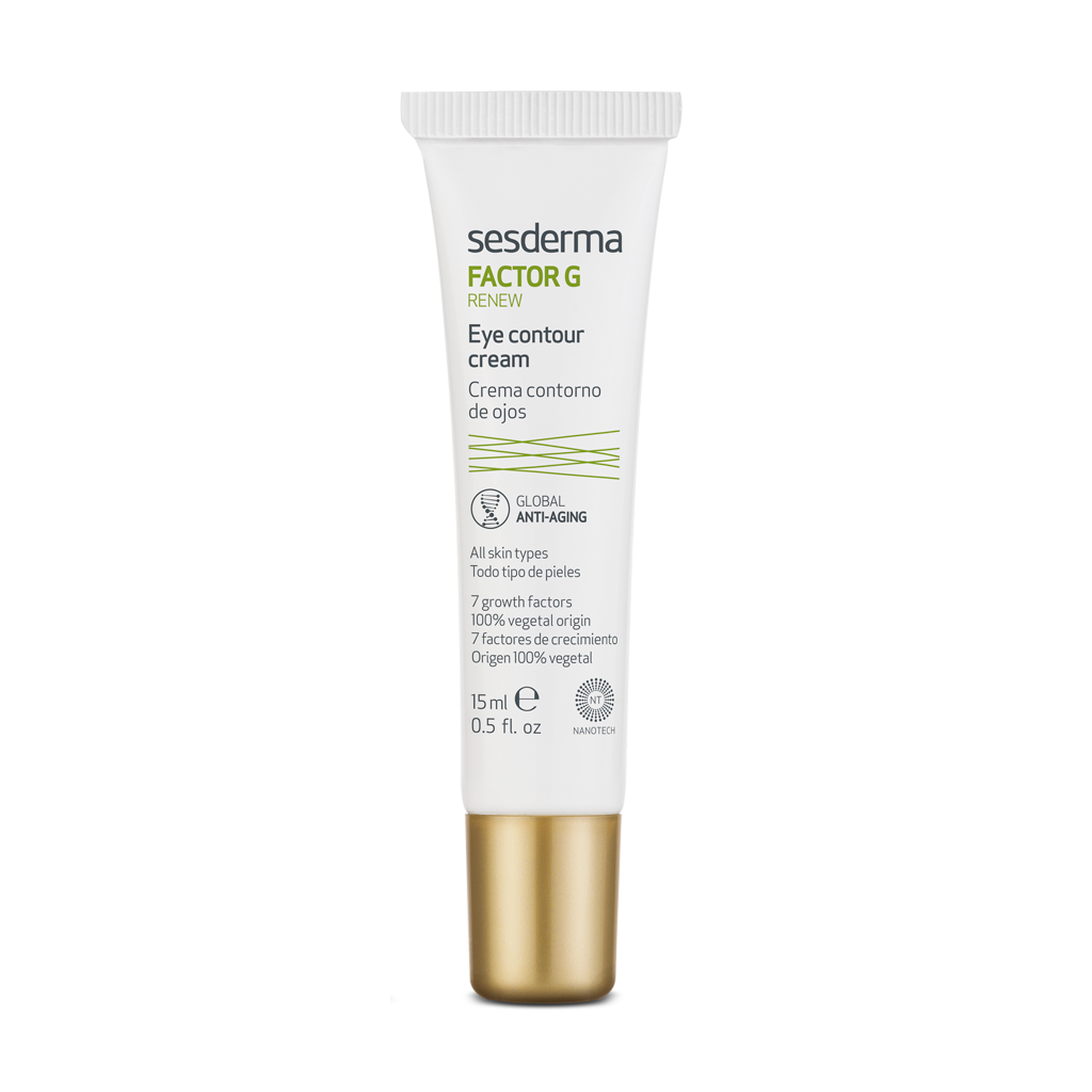 Crema anti edad para la zona del contorno de ojos, formulada con biotecnología. 7 factores de crecimiento de origen vegetal, para reactivar los mecanismos de regeneración de la piel y un complejo de activos que actúan sobre las ojeras. Factor G Renew multiplica por 3 la síntesis de colágeno y elastina, para la reducción de las arrugas.
