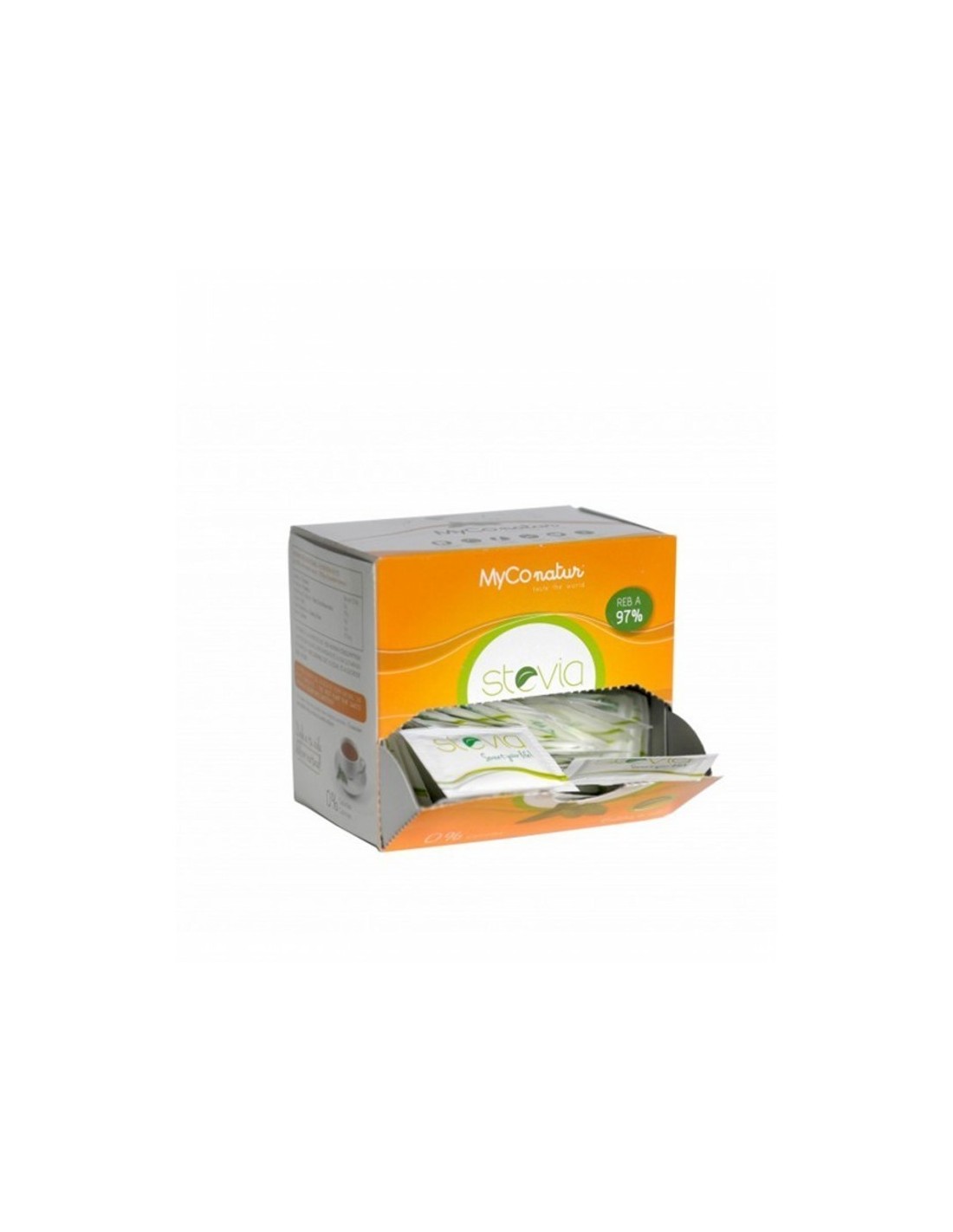 Caja con 60 sobres individuales de edulcorante de stevia. Apto para vegetarianos y veganos.