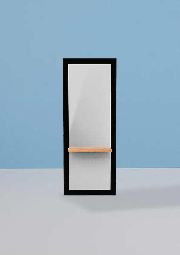 Se compone de dos espejos con encimera y un gran marco que unifica y armoniza el conjunto. Está fabricado en melamina. Los cantos de PVC van encolados de forma hermética, lo que evita que la humedad penetre en el interior. La encimera para colocar los utensilios de trabajo, ocupa una posición central entre ambos espejos.