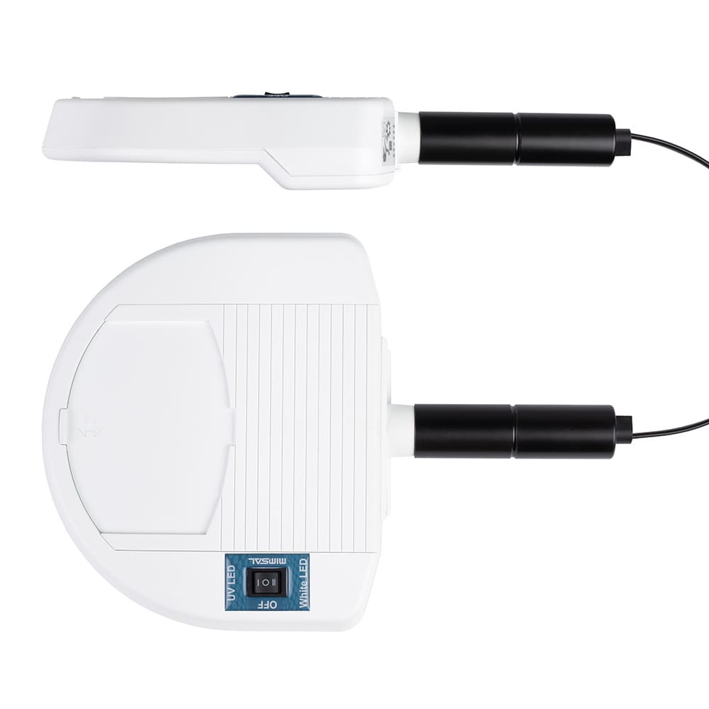 Lámpara con lente de aumento diseñada con tecnología LED para emitir dos tipos de luz: luz ultravioleta (UV) y luz blanca. Vista LED se emplea especialmente en dermatología, estética, veterinaria e investigación