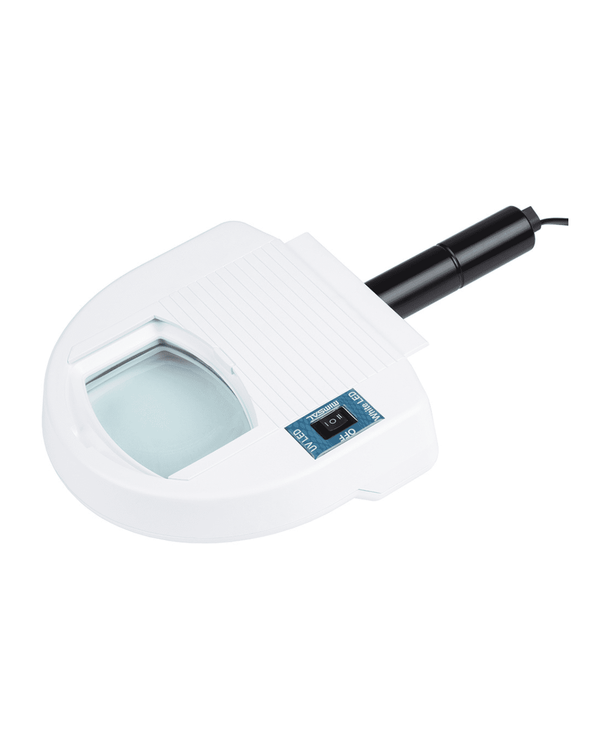 Lámpara con lente de aumento diseñada con tecnología LED para emitir dos tipos de luz: luz ultravioleta (UV) y luz blanca